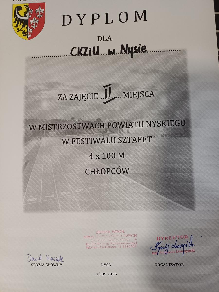 Sztafeta CKZiU w Nysie (4x100 metrów) zdobyła II miejsce i vice mistrzostwo Powiatu Nyskiego oraz awans do mistrzostw Województwa Opolskiego. |
